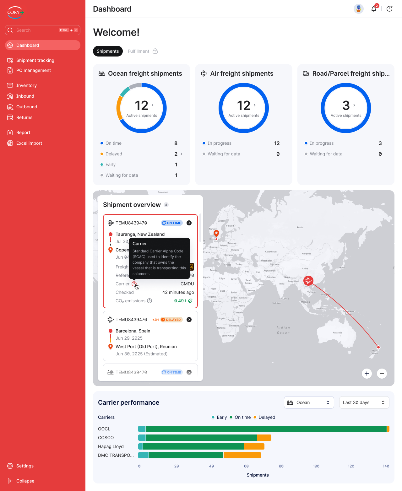 Cory+ operates as a comprehensive purchase order management system (POMS) with tracking down to the purchase order (PO) and SKU level, ensuring complete visibility from origin to destination. Users can track shipments regardless of mode or carrier, view CO2 emissions, and receive predictive ETAs that help mitigate delays and optimize decision-making.